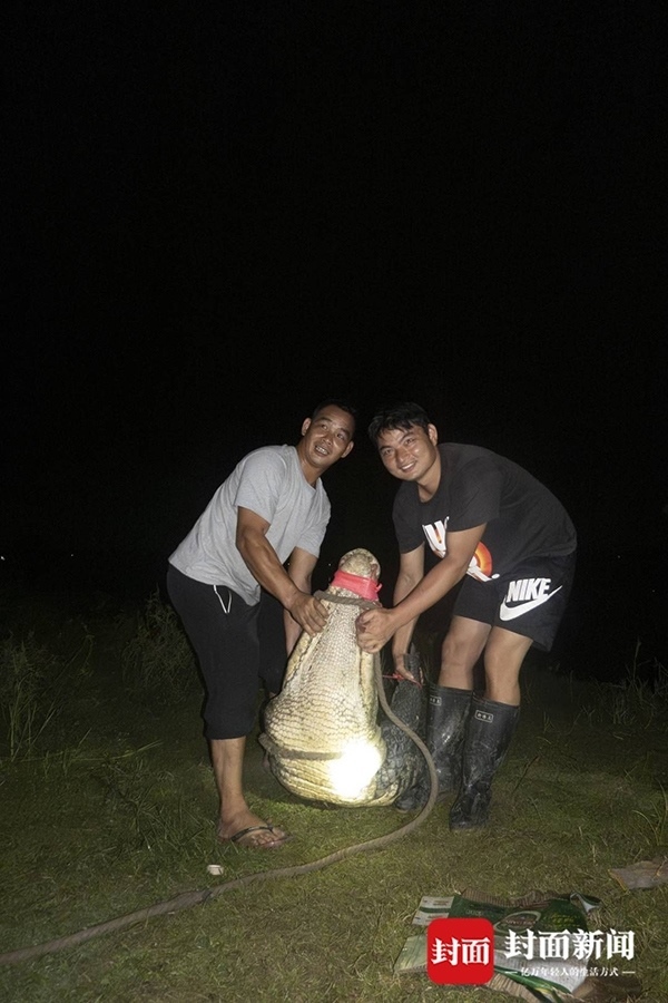 搜捕隊展示捕獲的鱷魚。