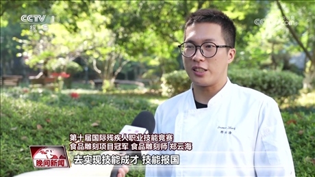 第十屆國(guó)際殘疾人職業(yè)技能競(jìng)賽食品雕刻項(xiàng)目冠軍 食品雕刻師 鄭云海最近有火炬(傳遞),寓意就是美好、和平,還有吉祥。我想用自己的技能去宣傳我們杭州亞運(yùn)會(huì)的一個(gè)文化。