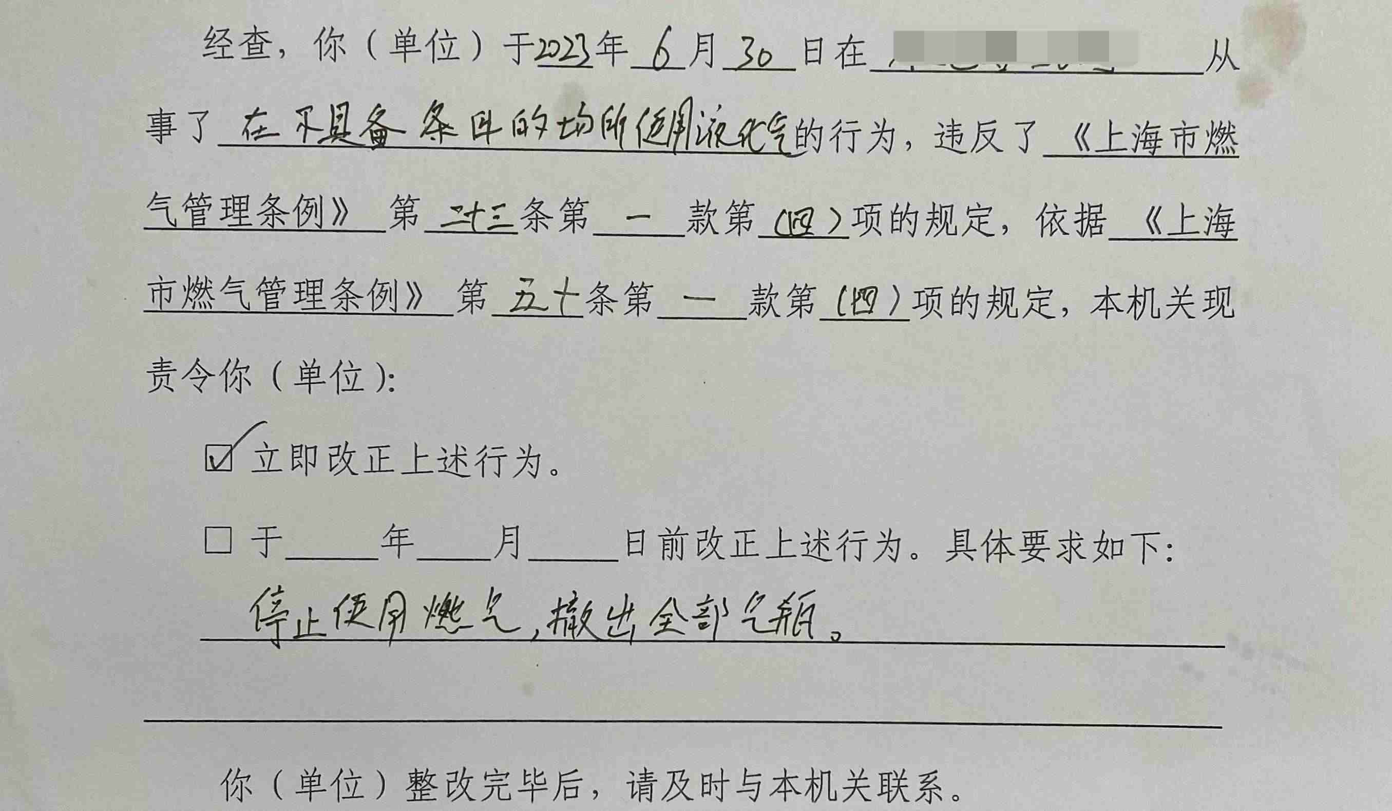 這并不是一次平常的燃氣用完后更換空瓶。大概一個小時前,市住建委相關(guān)部門的檢查人員走進餐館,檢查后責(zé)令整改,并在整改完成前暫停燃氣供應(yīng)。