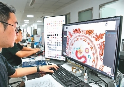 多彩貴州文化數(shù)據(jù)平臺有限公司的設(shè)計(jì)師在電腦上做苗繡矢量化提取。