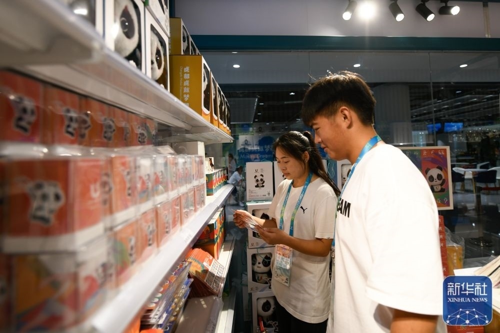 ↑7月14日,媒體工作人員在成都大運會主媒體中心大運會官方特許商品零售店內選購紀念品。新華社記者 胥冰潔 攝