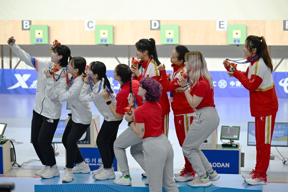 7月29日,大運(yùn)會(huì)射擊女子10米氣步槍團(tuán)體前三名選手在頒獎(jiǎng)儀式上合影。新華社記者 劉坤 攝