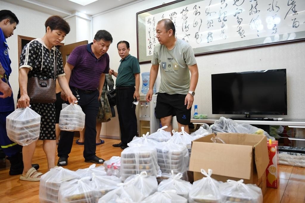 8月1日晚,河北省涿州市職業(yè)技術(shù)教育中心的工作人員正在運送飯菜,準(zhǔn)備發(fā)放給安置群眾。新華社記者 牟宇 攝