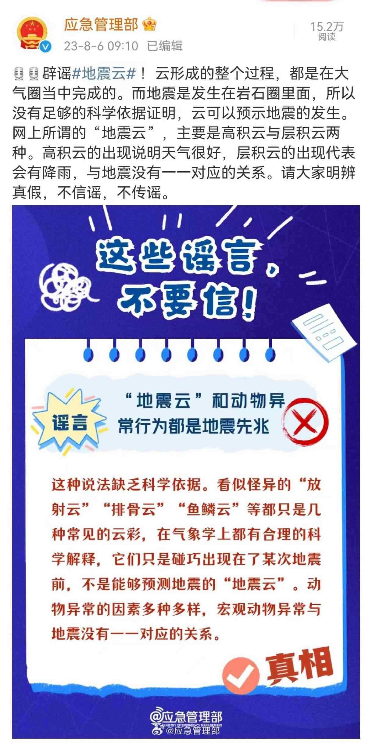人民網(wǎng)北京8月6日電 (周靜圓)據(jù)中國(guó)地震臺(tái)網(wǎng)正式測(cè)定:8月6日2時(shí)33分在山東省德州市平原縣發(fā)生5.5級(jí)地震,震源深度10千米。地震發(fā)生后,有網(wǎng)友曬出自己拍下的云層,有關(guān)“地震云能預(yù)測(cè)地震”的說(shuō)法在網(wǎng)絡(luò)上廣泛傳播。8月6日,應(yīng)急管理部官方微博就所謂“地震云”相關(guān)說(shuō)法進(jìn)行辟謠。