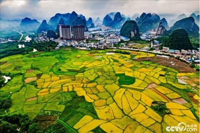 廣西柳州融水苗族自治縣融水鎮(zhèn)西廓村連片種植的水稻由青轉(zhuǎn)黃,豐收在望,田園與大山、村莊交相輝映,構(gòu)成一幅美麗的喀斯特地貌田園畫(huà)卷。