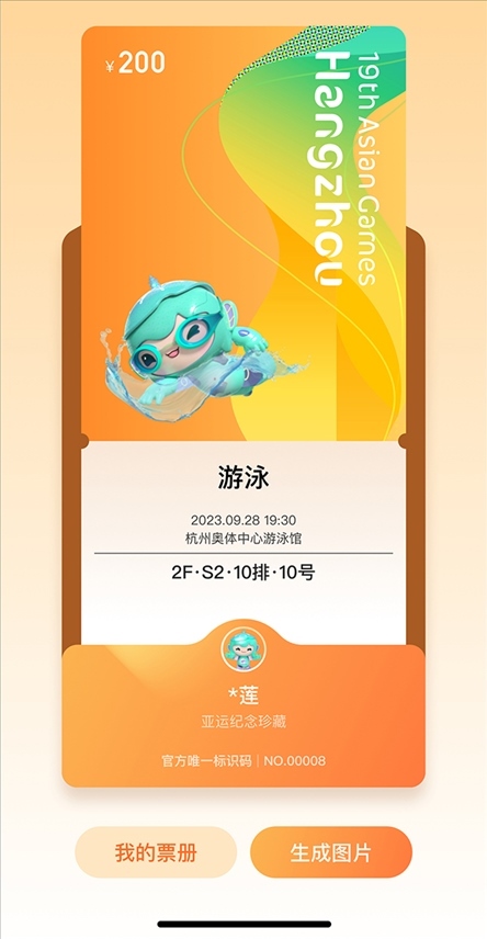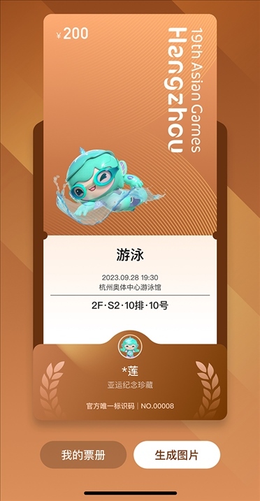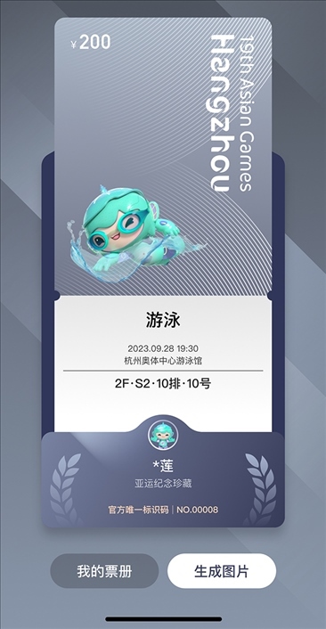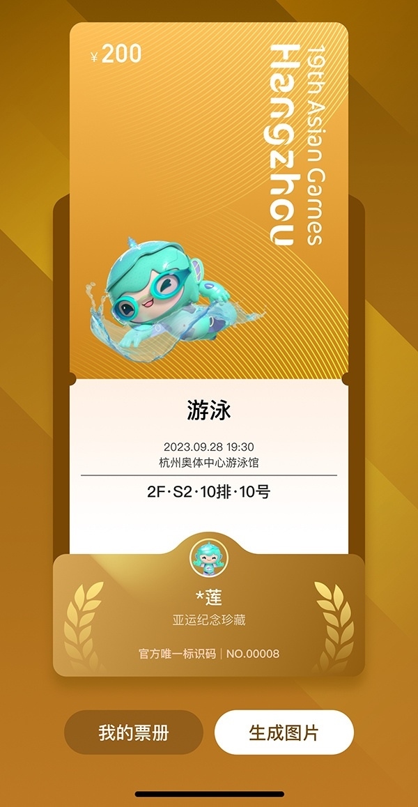 為呼吁全民助力綠色亞運(yùn),杭州亞運(yùn)會推薦使用電子票。凡購買電子票的用戶均可在公眾售票官網(wǎng)H5頁面、智能亞運(yùn)一站通?票務(wù)通票夾中抽取對應(yīng)項(xiàng)目的電子紀(jì)念票,生成專屬票冊,方便收藏、分享、傳播。電子紀(jì)念票分金、銀、銅、通用四種類型,抽中比例分別為5%、10%、15%、70%。電子紀(jì)念票和專屬電子票冊首次運(yùn)用于國內(nèi)舉辦的綜合性運(yùn)動會,是智能辦賽理念的生動體現(xiàn)。