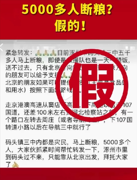 近日,網(wǎng)傳“河北省涿州市碼頭鎮(zhèn)5000多人將斷糧,救援隊也是一天只吃一頓飯,送不過去”消息,引發(fā)了眾多網(wǎng)民關(guān)注。