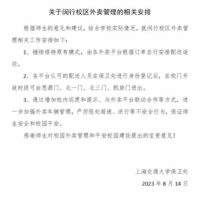 8月14日晚6點,有上海交大學生向記者反映,學校已更新關于閔行校區(qū)外賣管理的相關安排。安排顯示,維持原有模式,由各外賣平臺根據(jù)訂單自行安排配送途徑,各平臺認可的配送人員在保衛(wèi)處進行身份登記后,在校門開放時段可由學校四個校門進出;學校會通過增加校內巡邏和提示,與外賣平臺聯(lián)動合作等方式,進一步加強外賣車輛管理,嚴厲懲處超速、逆行等不安全行為,保證師生安全和校園平安。當晚,澎湃新聞記者了解到,閔行校區(qū)已有保安人員接到上級通知,維持原有模式,多名外賣騎手也從學校保安人員處獲知可正常進出校園。