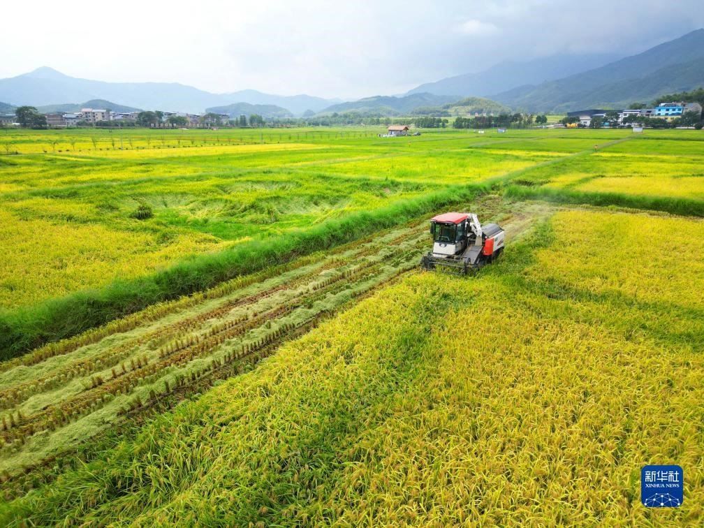 8月17日,收割機在福建省南平市浦城縣石陂鎮(zhèn)申明村田間收割水稻(無人機照片)。