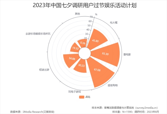 今年七夕恰逢工作日,大多數(shù)人選擇下班后再相聚?!爸袊呦?jié)日消費行為大數(shù)據(jù)調(diào)查”顯示,2023年消費者過節(jié)的娛樂活動計劃TOP3分別為:逛街購物、看電影、吃大餐。