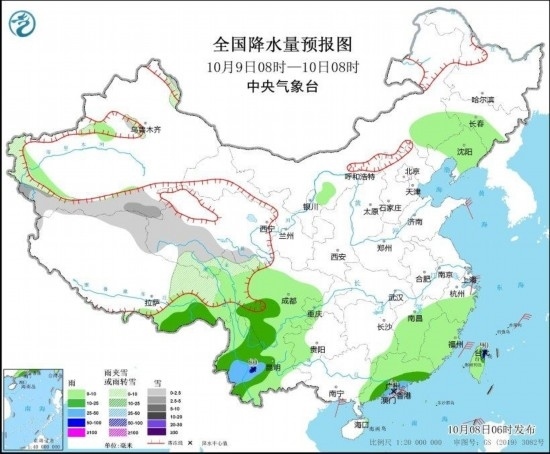 圖1 全國降水量預(yù)報(bào)圖(10月8日08時(shí)-9日08時(shí))