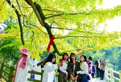 游客在貴州省貴陽市烏當區(qū)羊昌鎮(zhèn)黃連村的古銀杏樹下留影。新華社發(fā)