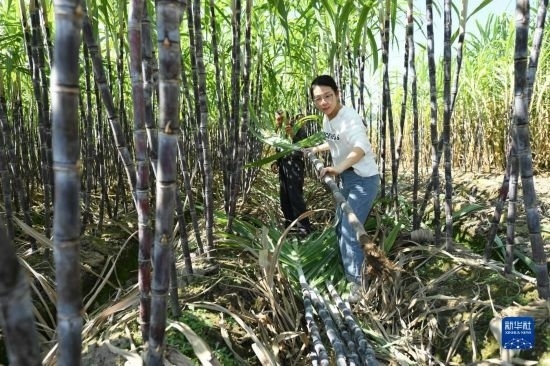 10月18日,在浬浦鎮(zhèn)外浦村的甘蔗田里,志愿者幫助農(nóng)戶(hù)收獲果蔗。