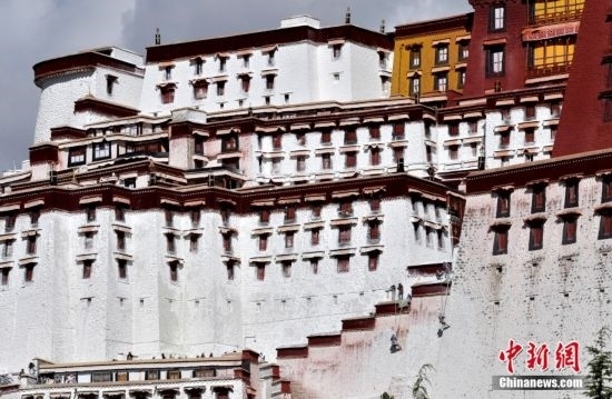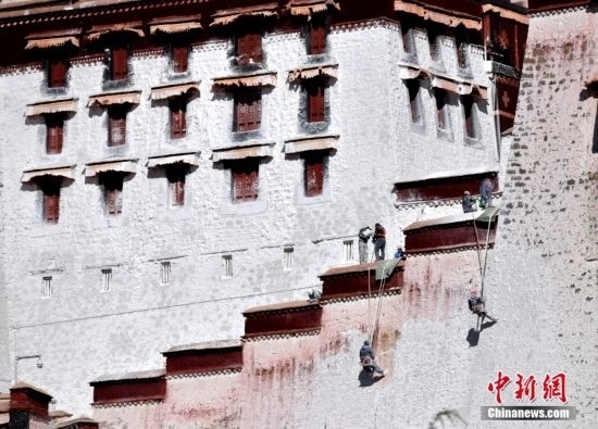 10月19日,西藏拉薩,工作人員對(duì)布達(dá)拉宮外墻噴灑涂料。每年秋冬交替時(shí)節(jié),布達(dá)拉宮外墻都要進(jìn)行粉刷“美顏”。按照慣例,每季粉刷將在藏歷9月22日“神降節(jié)”前完成。