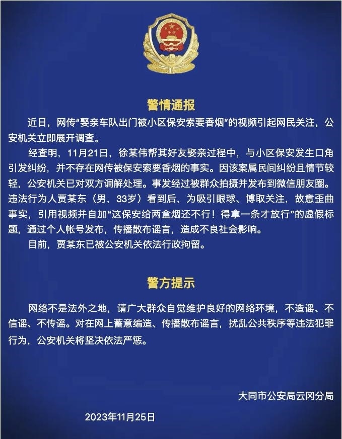 ·大同警方:網(wǎng)傳“娶親車隊(duì)出門(mén)被小區(qū)保安索要香煙”系謠言。