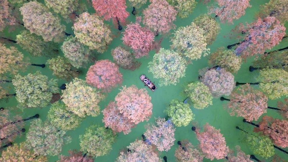 江蘇揚(yáng)州,游客在淥洋湖濕地公園的“水上森林”游玩。初冬時(shí)節(jié)的“水上森林”層林盡染,色彩斑斕,美景如畫(huà)。