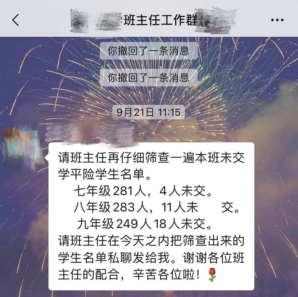 她要反復叮囑學生,同時在家長群一一驗收,“力求100%完成”。因為這些任務大多與她的績效掛鉤。但并非所有家長都愿意配合,因為需要確認的通知太多,她還為此被家長告到教育局。