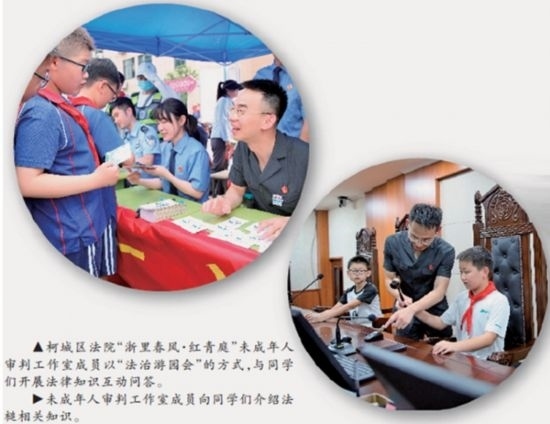 在法治教育課程上,柯城區(qū)法院根據(jù)轄區(qū)學(xué)校數(shù)量多、階段全的情況,在9所試點(diǎn)學(xué)校設(shè)立“紅青庭”校園法治輔導(dǎo)站,分別選任9名法治輔導(dǎo)員和9名法治宣傳員,根據(jù)未成年人身心特點(diǎn),協(xié)助創(chuàng)新法治教育課程內(nèi)容和形式,已就反詐、防性侵等內(nèi)容開(kāi)展模擬法庭、情景劇等活動(dòng)12次。