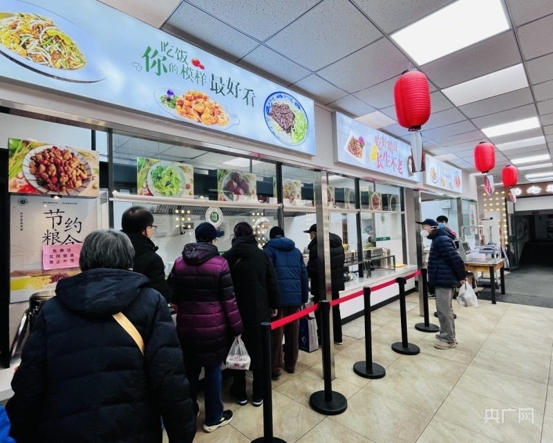 天津市和平區(qū)南營門街道老人家食堂內(nèi),老人們排隊就餐(央廣網(wǎng)記者 褚夫晴 攝)