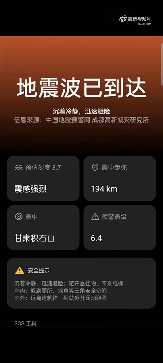 除甘肅地區(qū)外,很多周邊地區(qū)的居民也都及時收到了地震預(yù)警: