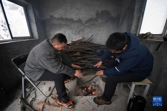 12月19日,尹斌(右)和龍昱君在110千伏西公線003號監(jiān)測哨所休息。這座水泥小屋在2020年修建,以便輸電運(yùn)檢工觀測融冰時休息。