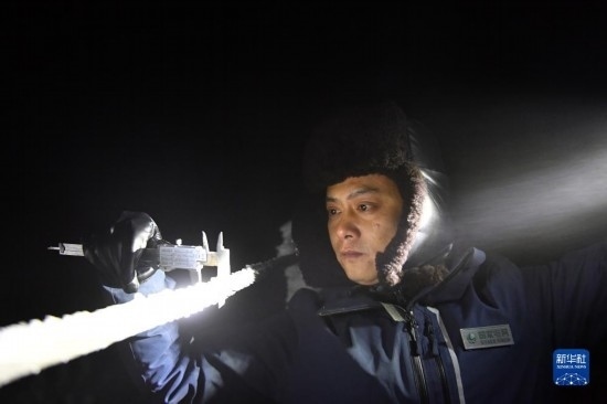 12月18日夜間,尹斌在110千伏西公線001號監(jiān)視哨所用游標(biāo)卡尺測量導(dǎo)線覆冰厚度。