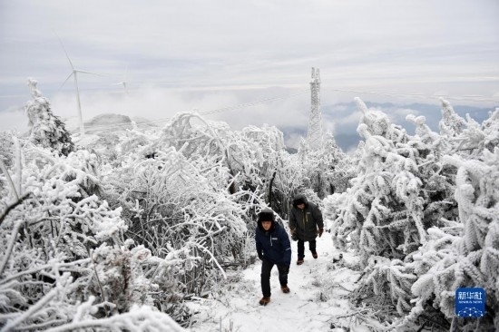 12月19日,尹斌(前)和龍昱君在110千伏西公線003號監(jiān)測哨所觀測覆冰情況后返回。