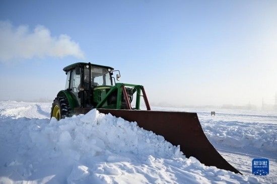12月19日,在內(nèi)蒙古呼倫貝爾市鄂溫克族自治旗伊敏蘇木,工作人員駕駛大型機械清理牧區(qū)道路積雪。