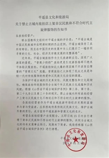 ·平遙古城禁止旅拍店上架非漢民族服飾?當?shù)匚穆镁只貞耗壳耙褎h除該告知書。