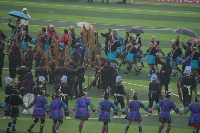 隊(duì)旗招展、蘆笙悅響、鑼鼓喧天……1月6日一早,冒著淅瀝小雨,在貴州省黔東南苗族侗族自治州榕江縣的“村超”球場(chǎng),歡快的多耶舞和炫目的煙花過后,2024年“村超”賽季正式拉開帷幕。