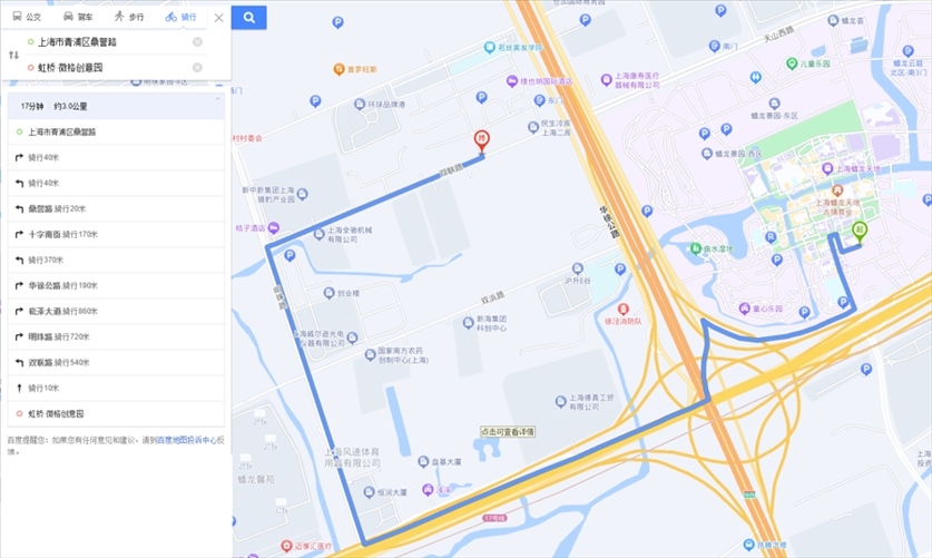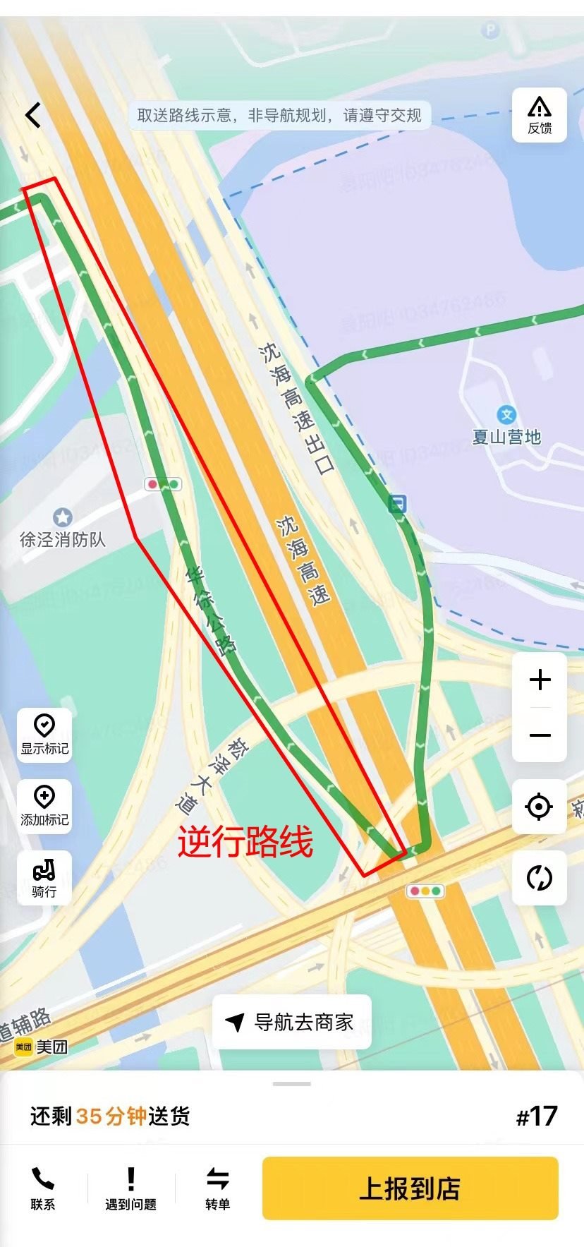 “途經(jīng)滬青平公路時,平臺也愛規(guī)劃逆行路線。”陳陽陽提供的第3條逆行路線正屬于這一情況。這是從京華路187弄送往南山雨果小區(qū)的一單,平臺規(guī)劃的路線中,指示騎手從明珠路右拐進入滬青平公路向西騎行至葉聯(lián)路再向南。可是,滬青平公路在葉聯(lián)路路口處沒有過街橫道線,此時,平臺索性規(guī)劃騎手沿著滬青平公路南側逆向騎行。1月8日,記者實地走了一遍這段路線:若騎手沿著滬青平公路北側騎行,需一直向西騎到徐盈路才能過街,再沿著滬青平公路南側向東抵達葉聯(lián)路。手機顯示,繞行路線比美團平臺規(guī)劃路線遠了1.2公里。