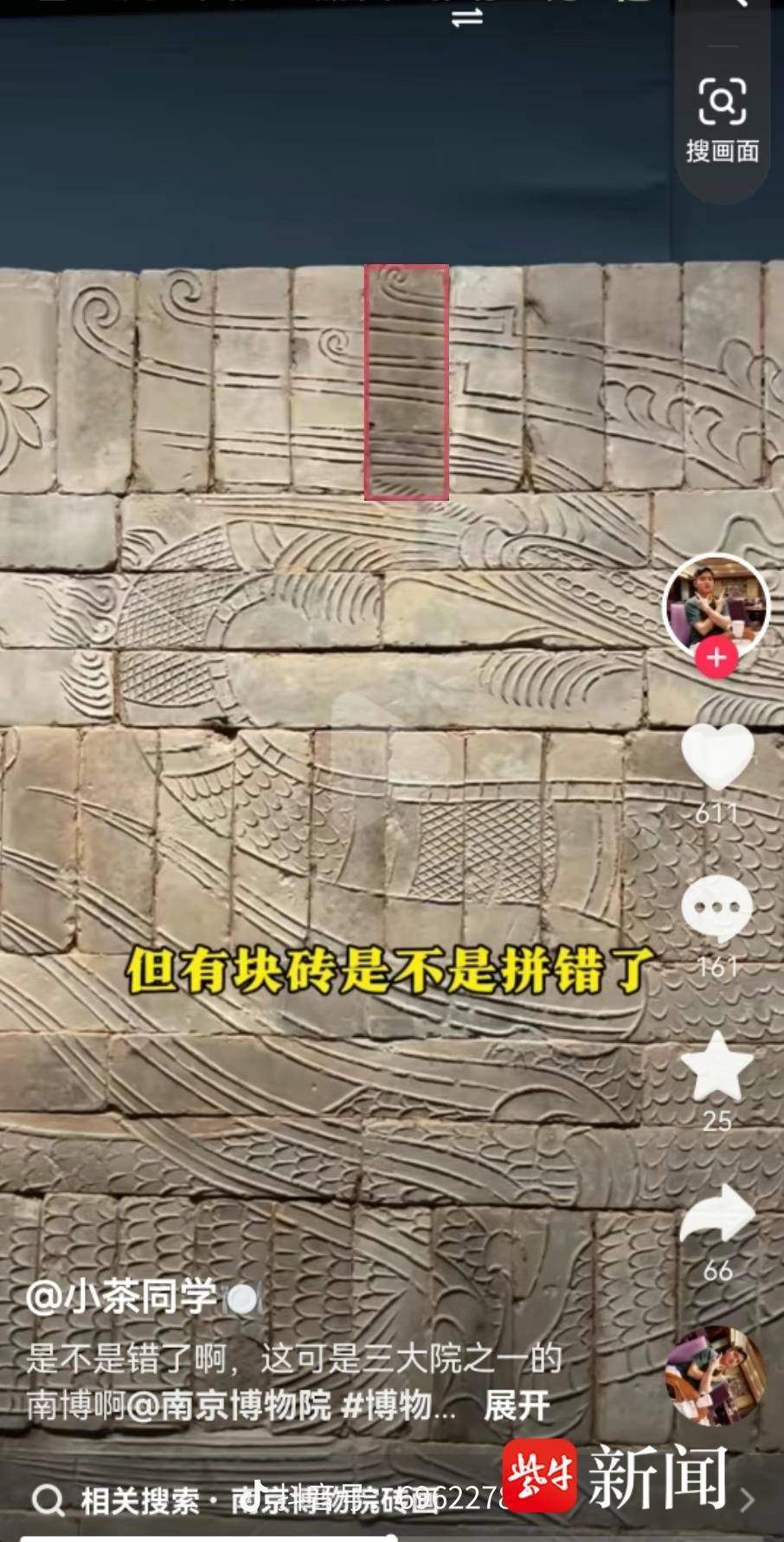 “家人們,我好像在南博發(fā)現(xiàn)了一件展品有一處錯誤”,網(wǎng)友“小茶同學(xué)”發(fā)視頻表示,“1月25日去南京博物院游覽,在看到《羽人戲龍磚畫》時,發(fā)現(xiàn)磚畫很精美,保留很完整。磚畫上的陽刻線條尤其讓我感到震撼,看到深色磚的部分,我感覺有點別扭,當(dāng)時就臆想著那塊磚反過來是不是更好一點,于是發(fā)了一個視頻求助?!?/p>