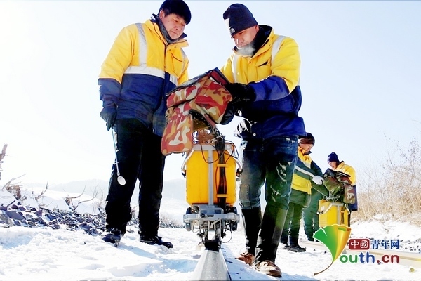 兩臺(tái)超聲波鋼軌探傷儀,在身穿橙黃色工作服的探傷工的推行下,緩緩向線路遠(yuǎn)方走去。寒風(fēng)中,探傷工們從頭到腳的防寒裝備也為他們?cè)诙臼彝庾鳂I(yè)提供了保障。