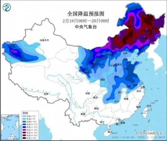 全國(guó)降溫預(yù)報(bào)圖(2月18日8時(shí)-20日8時(shí))