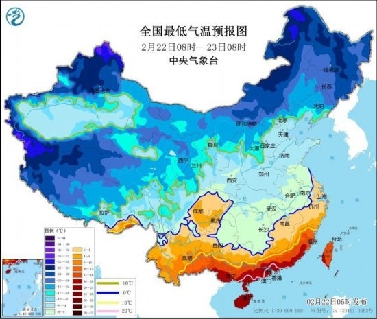 全國最低氣溫預(yù)報(bào)圖(2月22日8時(shí)-23日8時(shí))