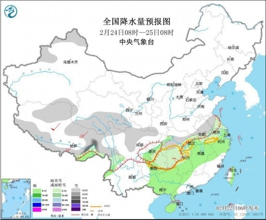 2月24日8時(shí)至25日8時(shí),新疆北部、西藏西部和東部、青海南部、川西高原中北部、云南西北部、貴州東部、重慶東部、湖南中北部、湖北中南部、河南南部、安徽大部、江蘇大部等地部分地區(qū)有小雪或雨夾雪,其中,西藏東南部有中到大雪。西藏東南部、重慶中部、貴州中部、江淮東部、江南大部、華南西部和北部、海南島、臺(tái)灣島等地部分地區(qū)有小雨。西藏中部等地部分地區(qū)有5~6級(jí)風(fēng),陣風(fēng)7~8級(jí);東海西部、臺(tái)灣海峽、南海東北部海域有6~7級(jí)風(fēng)、陣風(fēng)8級(jí)。