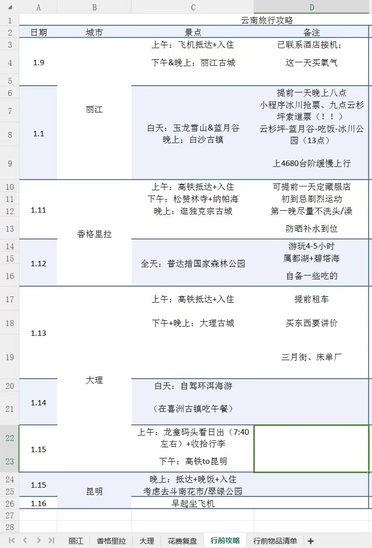 這個(gè)冬天去云南旅行前,周玫將自己的計(jì)劃制成一張excel表格,具體到每個(gè)市、每個(gè)景點(diǎn)、每種美食……旅行結(jié)束后,她還對(duì)云南游的具體執(zhí)行情況進(jìn)行了復(fù)盤(pán)總結(jié),在社交平臺(tái)上分享給她的“電子驢友”。
