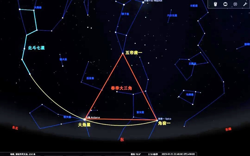 ?。?)沿著北斗七星的勺柄曲線進行延伸,可以找到牧夫座α,這顆星我們一般稱之為“大角星”。