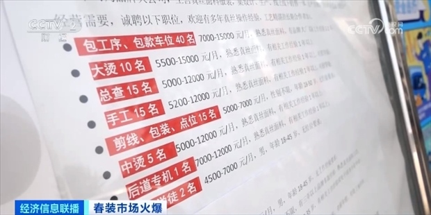 服裝批發(fā)生意的火熱,也帶來了用工需求的增加,不少檔口都貼上了招工的廣告。廣東深圳南油服裝批發(fā)市場批發(fā)商戶 邱林:現(xiàn)在的翻單需求量比較大,大家都在搶工人,現(xiàn)在排單排到快半個月、十幾天,我們店鋪還在招店員。