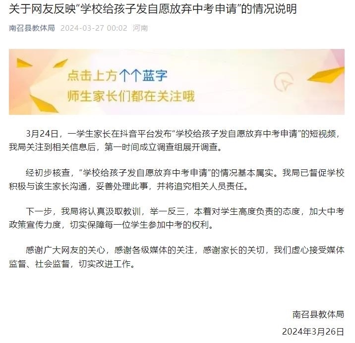 央視網(wǎng)消息:南召縣教體局3月27日發(fā)布《關(guān)于網(wǎng)友反映“學(xué)校給孩子發(fā)自愿放棄中考申請(qǐng)”的情況說(shuō)明》。