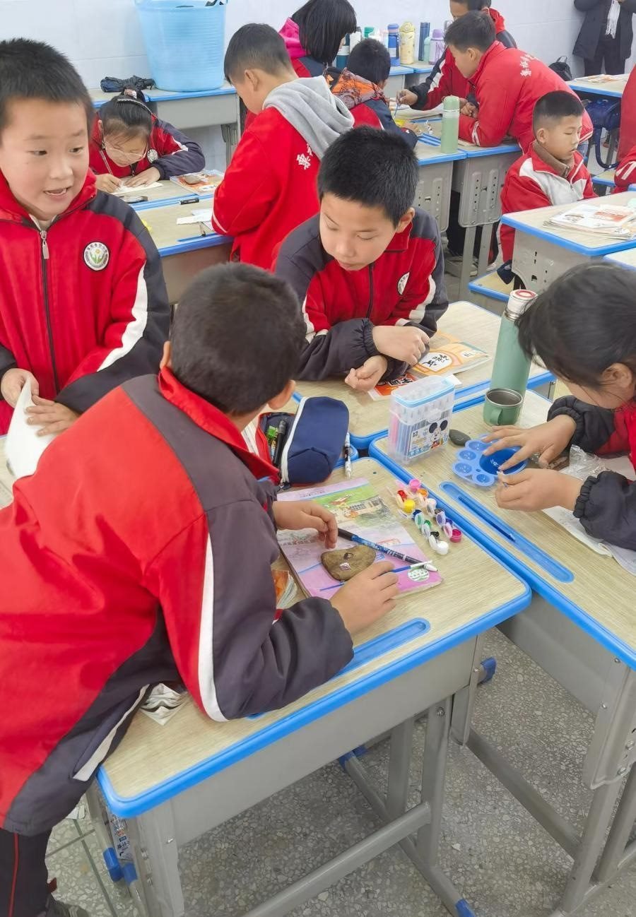 美術課上,李柏霖讓孩子們在石頭上作畫
