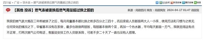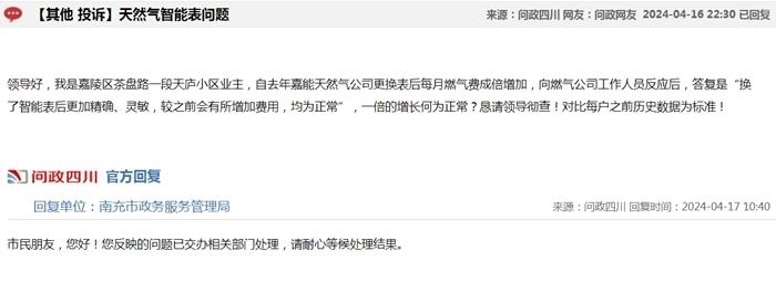 中新網(wǎng)4月17日電(中新財(cái)經(jīng)記者 吳濤)近日,在“問政四川”平臺(tái)上,不少網(wǎng)友反映“更換新表后燃?xì)赓M(fèi)異常上漲”,這些留言顯示來(lái)自四川成都、自貢、廣安、南充等多地,僅僅在4月16日,保守估計(jì)就有十幾條;17日上午又出現(xiàn)十幾條。大部分尚未得到回復(fù),部分獲得官方回復(fù)稱“留言已轉(zhuǎn)交給相關(guān)機(jī)構(gòu)進(jìn)行處理”。