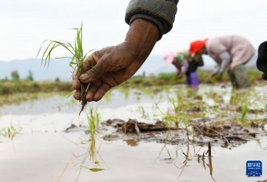 5月5日,農(nóng)民在云南省麗江市古城區(qū)金山街道東元社區(qū)的農(nóng)田里移栽水稻秧苗。