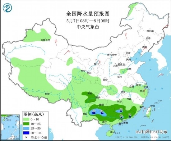 全國降水量預(yù)報(bào)圖(5月7日08時(shí)-8日08時(shí))