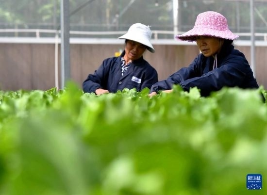 5月15日,工作人員在福州市長(zhǎng)樂(lè)區(qū)雪美農(nóng)業(yè)蔬菜基地智能溫控大棚內(nèi)采摘綠色蔬菜。