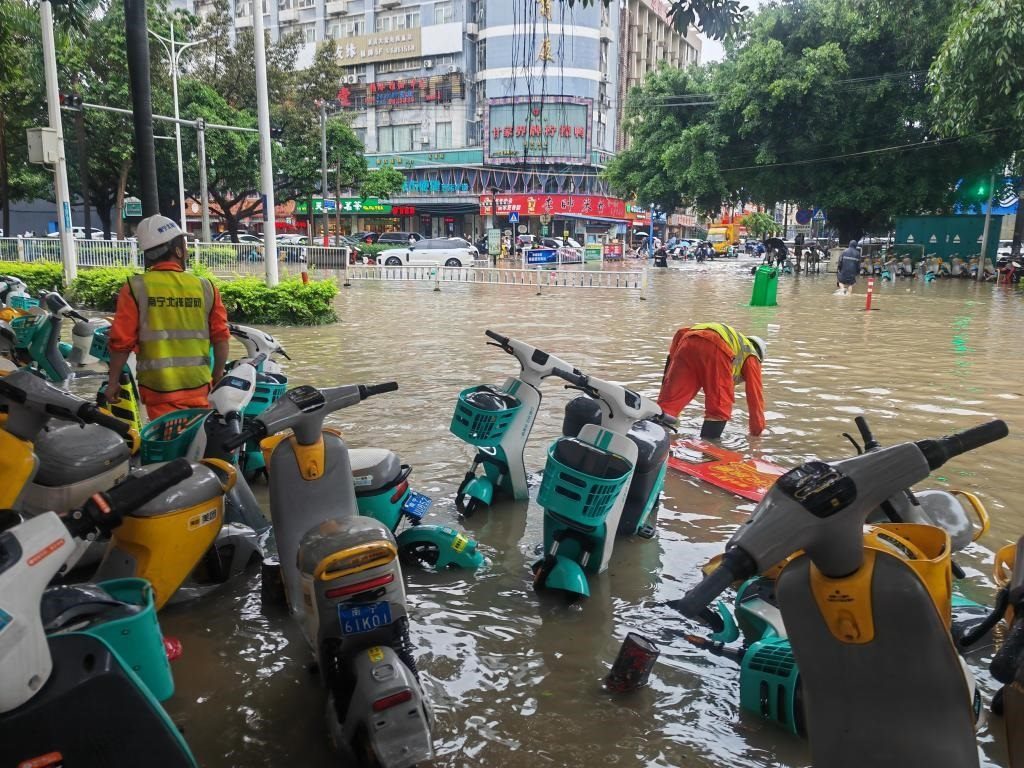 受暴雨影響,南寧市部分城區(qū)發(fā)生內(nèi)澇,一些低洼地帶積水較深。記者在南寧市青秀區(qū)東葛路一帶看到,一些地方積水深度為0.5米左右,不少電動(dòng)自行車側(cè)倒在馬路兩邊,有數(shù)輛小汽車熄火停在路中間。一名群眾告訴記者,19日凌晨3時(shí)左右突降暴雨,大量雨水灌入地勢較低的地下車庫,一些來不及轉(zhuǎn)移的車輛被淹。