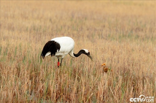 黑龍江省齊齊哈爾市扎龍國家自然保護(hù)區(qū),國家一級保護(hù)動(dòng)物野化的一對丹頂鶴夫妻成功孵化一個(gè)丹頂鶴寶寶,丹頂鶴夫妻蘆葦蕩里叼著食物喂小寶寶,丹頂鶴寶寶毛茸茸的非常可愛。