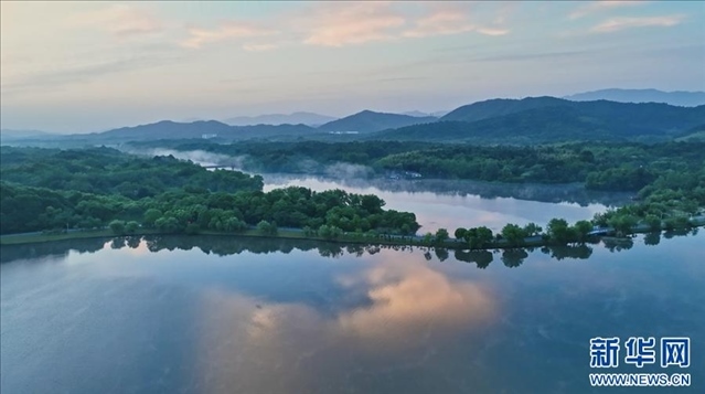 初夏雨后,位于安徽省池州市的平天湖風(fēng)景區(qū)一派恬靜安詳景象,寬闊碧綠的湖面平靜如鏡,倒映著周圍的山巒和樹木,形成了一幅美麗的山水畫卷。
