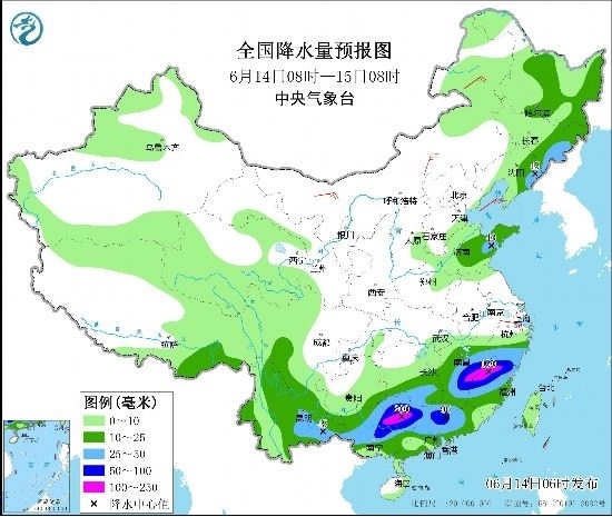 預(yù)計(jì),6月14日08時(shí)至15日08時(shí),江西中東部、浙江南部、福建西部和北部、湖南南部、云南東南部、廣西中北部、廣東中北部以及吉林東部、遼寧東北部、山東南部等地部分地區(qū)有大到暴雨,其中,江西東部、福建西北部、廣西東北部等地部分地區(qū)有大暴雨(100~200毫米)。上述部分地區(qū)伴有短時(shí)強(qiáng)降水(最大小時(shí)降雨量30~50毫米,局地可超過(guò)80毫米),局地有雷暴大風(fēng)或冰雹等強(qiáng)對(duì)流天氣。中央氣象臺(tái)6月14日06時(shí)發(fā)布暴雨黃色預(yù)警(見(jiàn)圖1)。