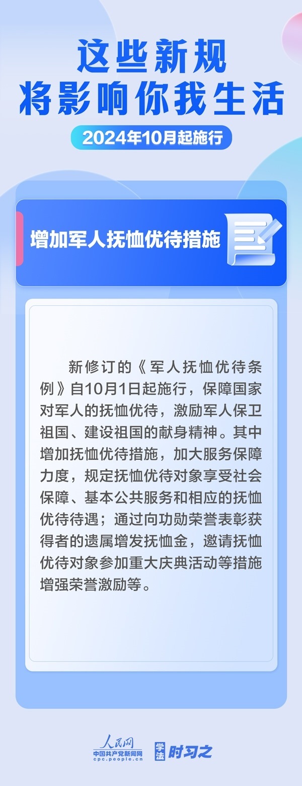 增加軍人撫恤優(yōu)待措施;全鏈條規(guī)范養(yǎng)老機構收費行為;電動自行車用鋰電池實施強制性產(chǎn)品認證……10月起,這些新規(guī)施行,將影響你我生活。